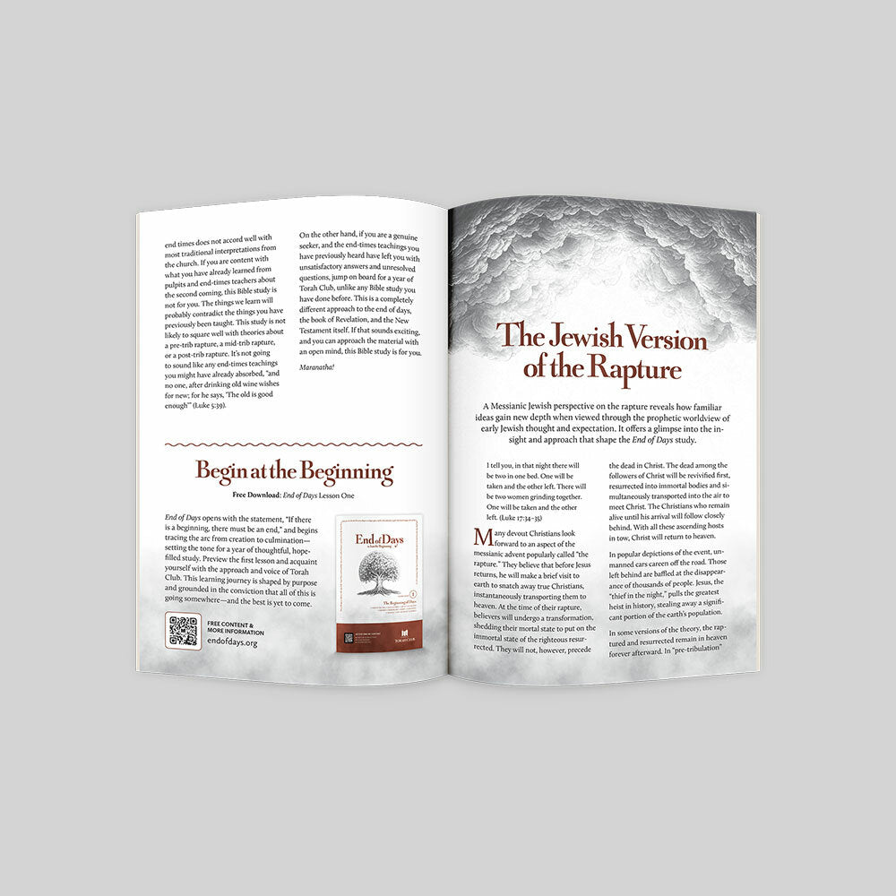 This short booklet lays the foundation for End of Days, Torah Club’s year-long study of Jewish eschatology and the Book of Revelation. It includes a compelling introduction to why eschatology matters, what makes this study unique, and how a Jewish perspective reframes our understanding of the end times. It also features a thought-provoking article on the “rapture” from a Jewish point of view, giving new students a clear glimpse of the kind of rich, contextual teaching they can expect throughout the study.